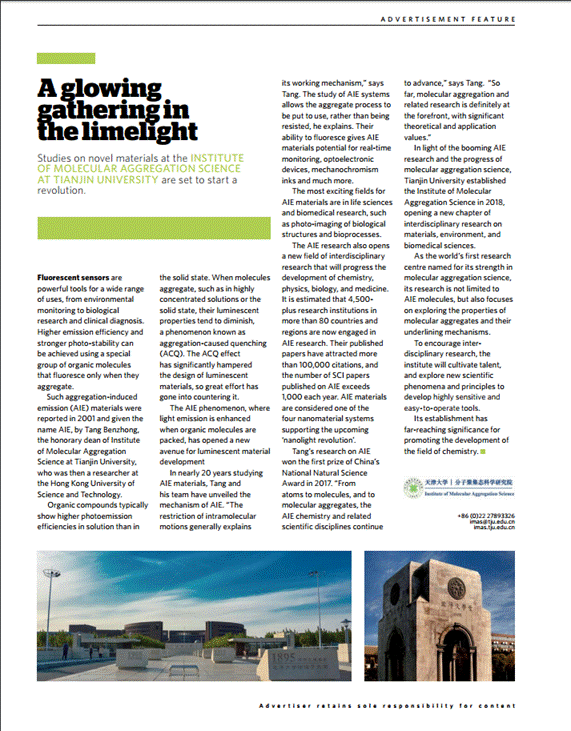 2019年3月21日《自然》(Nature)正刊以“聚焦材料中国”为主题,专栏介绍了天津大学分子聚集态科学研究院的建立、研究特色及未来发展方向。