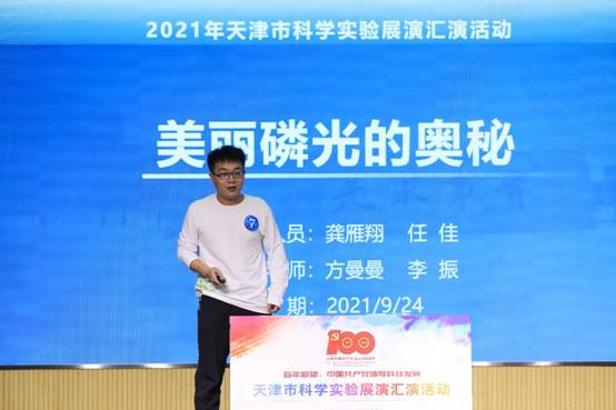 为贯彻落实天津市委、市政府关于深入推进全域科普的总体要求,弘扬科学精神,传播科学思想,倡导科学方法,9月24日,由市科技局、市教委主办的“2021年天津市科学实验展演汇演活动”在天津市少年儿童活动中心举行。本次活动以“百年回望:中国共产党领导科技发展”为主题。我院参演的作品《美丽磷光的奥秘》在青年教师方曼曼博士和李振教授的指导下,由我院硕士研究生龚雁翔和博士研究生任佳共同完成,主要展示了光刺激诱导室温磷光材料奇特的发光现象以及在信息写入与擦除、微裂纹无损检测领域的应用。经过激烈的角逐,我院的作品从62个节目中脱颖而出,闯入决赛,并在市级决赛中荣获优秀奖。