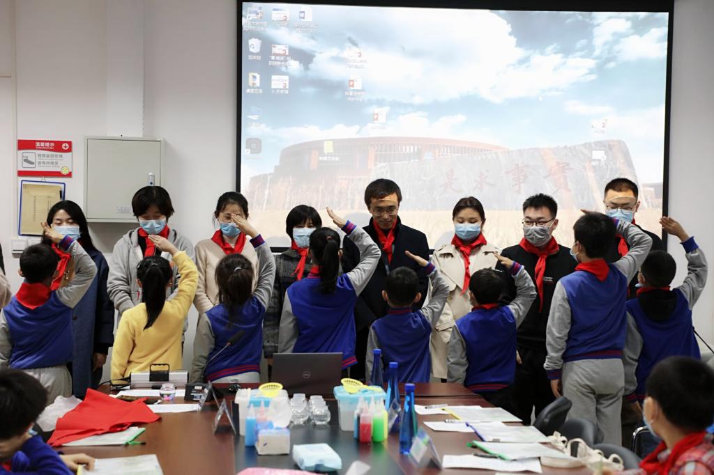 当日下午,分子聚集态科学研究院迎来了一群活泼可爱的小同学,初冬清冷的校园增添了浓浓的生机。主题实践活动开始前,天大附小的学生们用稚嫩的双手给学院的老师同学们带上鲜艳的红领巾,并致以整齐的队礼。