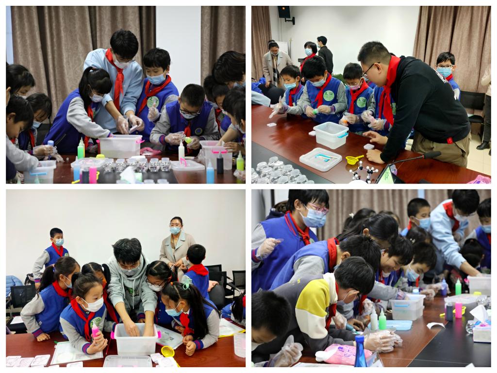 第三组实验“有趣的水凝胶”由研究生第二党支部指导教师杨琨老师和宋子昂同学主讲,介绍了水凝胶的应用及原理。小朋友们争先恐后举手发言,并在研究院哥哥姐姐们的指导下,亲自动手参与水凝胶制作,收获了属于自己的水凝胶成品。