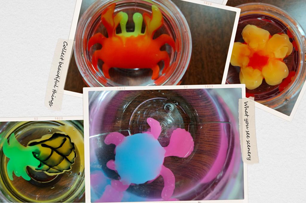 主题实践活动向小朋友们展示了三组趣味实验:有机夜明珠、点水成冰、有趣的水凝胶。