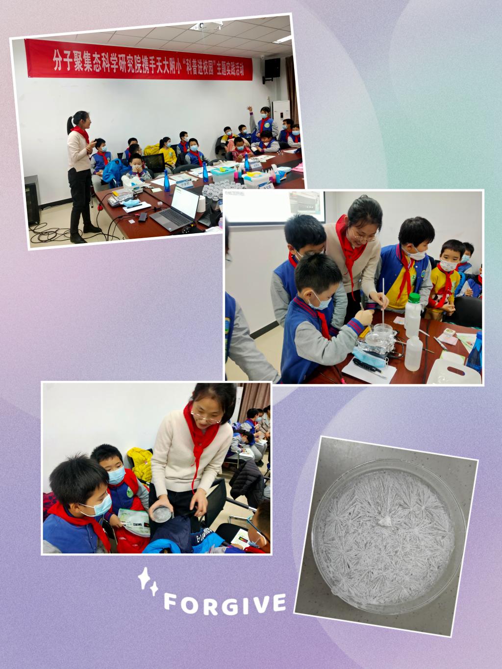 为落实立德树人根本任务,推进“三全育人”、“五育并举”人才培养综合改革工作,结合天津市教委及我校关于助力“双减”志愿服务的有关要求,发挥我院学生志愿服务和社会实践的专业优势,11月16日,天津大学分子聚集态科学研究院携手天大附小策划推出“科普进校园”主题实践营,开展了一场生动有趣、内容丰富的科普实践活动。通过一系列趣味科学实验以及实验室现场参观等形式,带领附小学生们感受分子聚集态科学魅力,体验化学实验乐趣。