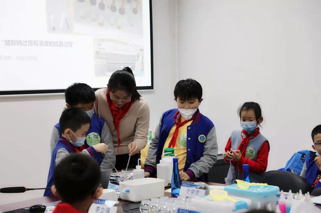 第二组实验“点水成冰”由研究生第一党支部指导教师李洁老师主讲,为同学们讲解了晶体基本知识及应用,并展示了醋酸钠过饱和溶液的结晶过程。小朋友们与李洁老师一起动手操作,在了解科学知识的同时,成功地呈现“点水成冰”科学现象,亲身体验做实验的乐趣。