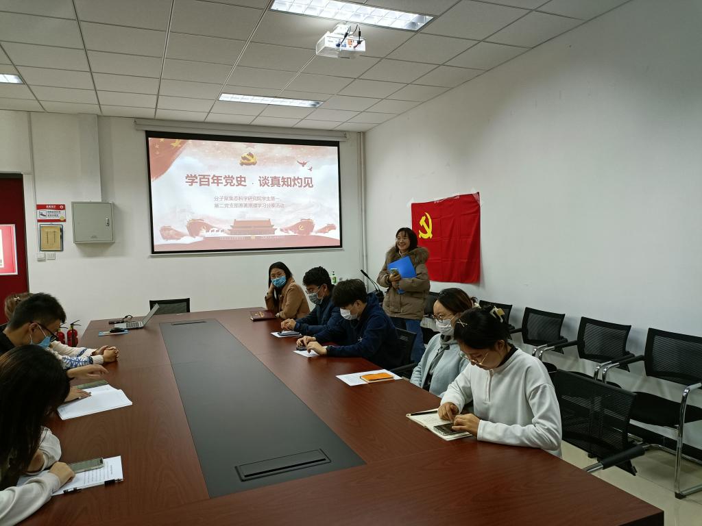 为深入学习习近平总书记重要讲话精神,积极推进党史学习教育,深化学习型党组织建设,落实上级党组织要求,11月19日,分子聚集态科学研究院研究生第一、二党支部共同开展了“学原著、悟原理”学习心得分享交流活动。本次活动由第一党支部李舒豫书记主持,第一党支部党建指导老师——李洁老师及第一、二党支部学生党员参加。