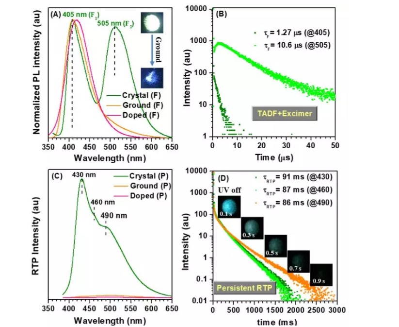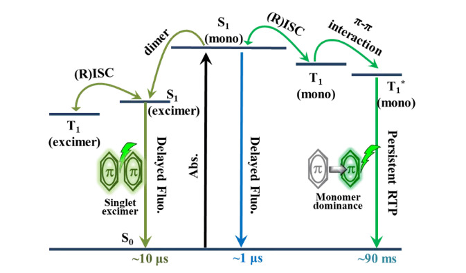 天津大学分子聚集态科学研究院研究团队研究人员通过巧妙的分子设计首次获得了一个同时具有室温磷光、热活化延迟荧光和单线态激基缔合物发光的纯有机化合物,实现了对三重态激子和单重态激子衰减行为的深度解析。该项工作是首次尝试根据明确的实验结果揭示二聚体在RTP效应中的实际作用,借助独特的分子设计将分子二聚体在长寿命RTP发射中的作用及其激发态过程得以清楚展现。