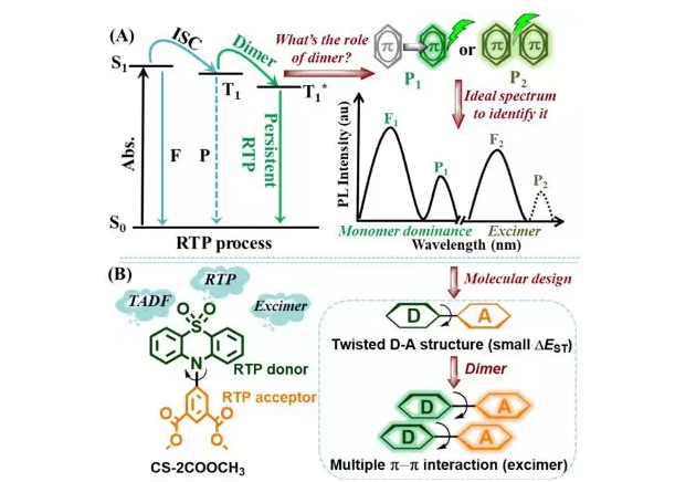 图1 (A)问题的提出:分子二聚体在RTP发射过程中的确切作用是什么,以及这一问题的解决方案,其中F1表示单分子占主导的荧光,P1表示单分子占主导的磷光,F2表示单线态激基缔合物荧光,P2表示三线态激基缔合物磷光;(B)目标化合物CS-2COOCH3的分子设计策略。