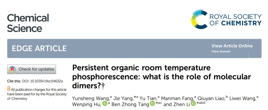 近日,天津大学分子聚集态科学研究院研究团队在英国皇家化学会旗舰期刊Chemical Science上发表论文Persistent organic room temperature phosphorescence: what is the role of molecular dimers?,目标化合物CS-2COOCH3同时具备室温磷光(RTP)、热活化延迟荧光(TADF)和单线态激基缔合物发光(singlet excimer emission)的特性,清晰描绘了室温磷光的详细光物理过程及其分子二聚体扮演的具体角色,首次通过明确的实验结果揭示了分子二聚体在RTP效应中的实际作用。