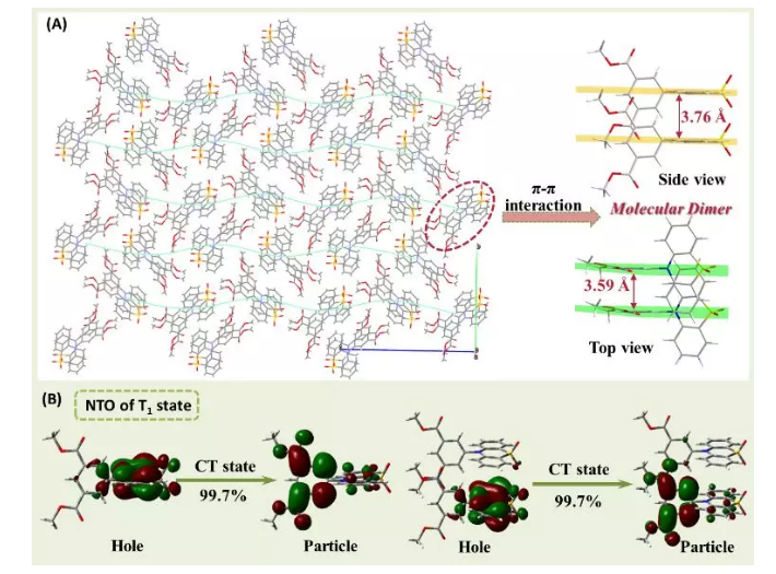 图4 (A) CS-2COOCH3的单晶结构分析;(B) CS-2COOCH3晶体中的单分子和分子二聚体T1态的自然跃迁轨道(NTO)计算。