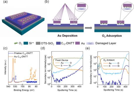 近日,天津大学李立强-陈小松团队在ACS Nano期刊上发表题为“Oxygen-Induced Barrier Lowering for High Performance Organic Field-Effect Transistors”的文章(DOI: 10.1021/acsnano.3c04177)。该研究通过将制备好的器件放置于氧气氛围下进行退火,从而在金属与有机半导体界面处引入氧,成功降低了接触势垒。该研究发现,在进行氧处理后,器件性能有着显著的提升,实现了89.8 Ω·cm的低接触电阻,11.32 cm2 V–1 s–1的高迁移率,并且开关比达到108。