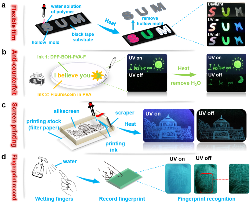 最后,由于这三种刺激响应性的长余辉材料能够完全在水溶液中制得,其加工过程安全环保,在信息防伪、丝网印刷和简单的指纹记录等领域表现出广阔的实用前景。