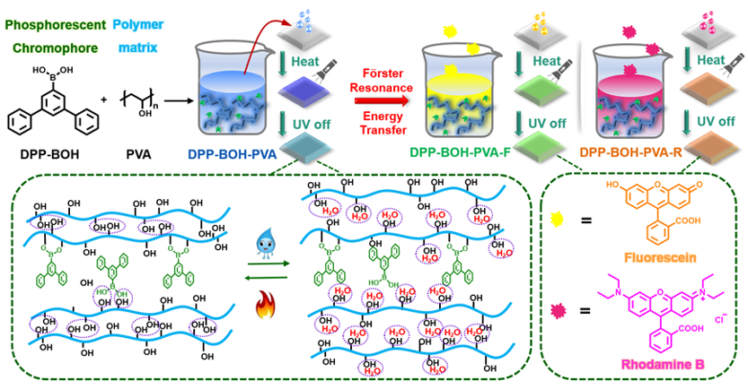 近日,李振教授团队在刺激响应性的纯有机室温磷光研究方面取得突破。他们通过将磷光发色团DPP-BOH与聚合物基质PVA在水溶液中共价连接,得到了一种新型的刺激响应性室温磷光材料。由于芳基硼酸和聚乙烯醇之间形成B-O共价键以及PVA链间的氢键相互作用提供的刚性环境,所制备的聚合物薄膜表现出超长的室温磷光,寿命达2.43 s,磷光量子产率为7.51%。有趣的是,水分子会破坏相邻PVA链间的氢键,从而改变该系统的刚性。因此,该薄膜的室温磷光特性对水、热刺激非常敏感。进一步地,通过在该体系中引入另外两种长波发射的荧光染料,聚合物薄膜的余辉颜色能够通过能量转移从蓝色调节到绿色再到橙色,并同时兼具刺激响应特性。最后,基于这三种长余辉材料的水/热刺激响应、多色调控以及完全水溶液处理等特点,它们被成功地应用于信息防伪、丝网印刷和指纹记录等领域。相关研究结果以“Completely Aqueous Processable Stimulus-Responsive Organic Room Temperature Phosphorescence Materials: Design Strategy, Tunable Afterglow Color and Corresponding Applications”为题,发表在《Nature Communication》(Nat. Commun., 2022, 13, 347)上。天津大学分子聚集态科学研究院博士研究生李丹为本文第一作者,共同通讯作者为杨杰副研究员、唐本忠院士和李振教授。