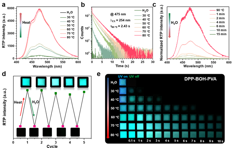 进一步,傅里叶变换红外光谱(FTIR)被用来研究其刺激响应性磷光特性。如图3b所示,DPP-BOH-PVA薄膜在被水蒸汽熏蒸后,3300 nm左右的羟基振动峰发生明显增强,且向短波束移动。该红外吸收峰的变化可以在一定程度上表明其薄膜内部的羟基缔合程度在水熏蒸后发生了改变。结合其在水刺激条件下室温磷光性质的改变,作者认为水分子的存在破坏了相邻PVA链之间的氢键相互作用,从而削弱了该体系的刚性,最终导致其室温磷光发生猝灭。当薄膜被加热时,水分子被去除,并且PVA链间的氢键被再次构建,从而恢复体系刚性及其相应室温磷光性能。因此,水分子对PVA链间氢键的影响是其产生水/热刺激响应室温磷光的主要原因。