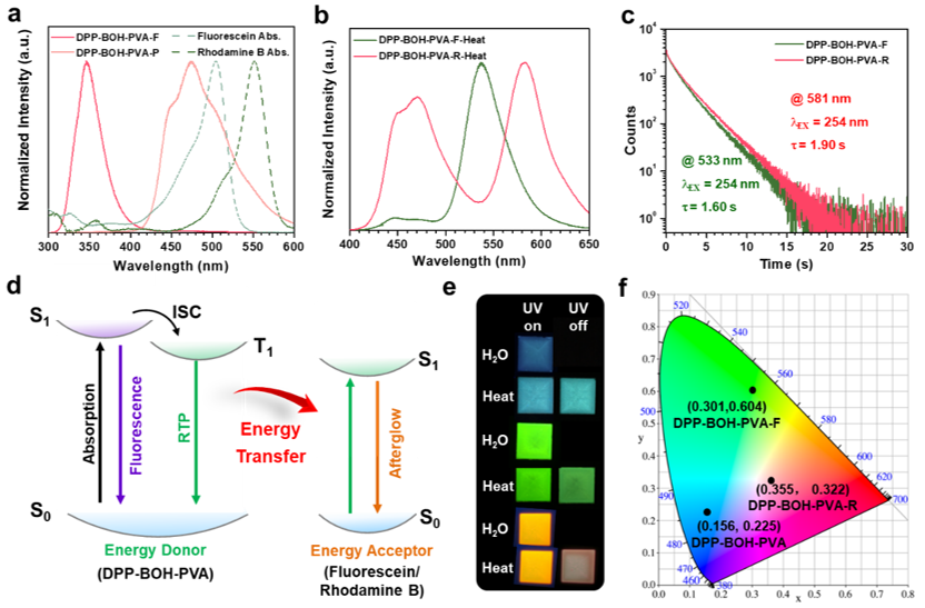 为了扩展该刺激响应室温磷光体系,作者还通过三线态到单线态的Förster共振能量转移对其余辉颜色进行了进一步调节。如图4所示,通过将长波发射的荧光素和罗丹明B掺杂到DPP-BOH-PVA中制备得到DPP-BOH-PVA-F和DPP-BOH-PVA-R。在关闭254 nm紫外灯照射后,DPP-BOH-PVA-F和DPP-BOH-PVA-R薄膜在环境条件下分别呈现绿色和橙色余辉,并且可被肉眼捕获超过10 s,相应的余晖寿命为1.60 s (@ 533nm)和1.90 s (@ 581 nm),能量转移效率为13.58%和9.47%。同时,由于水对PVA链间分子间氢键的影响,DPP-BOH-PVA-F和DPP-BOH-PVA-R薄膜同样表现出了水/热刺激响应发光特性。