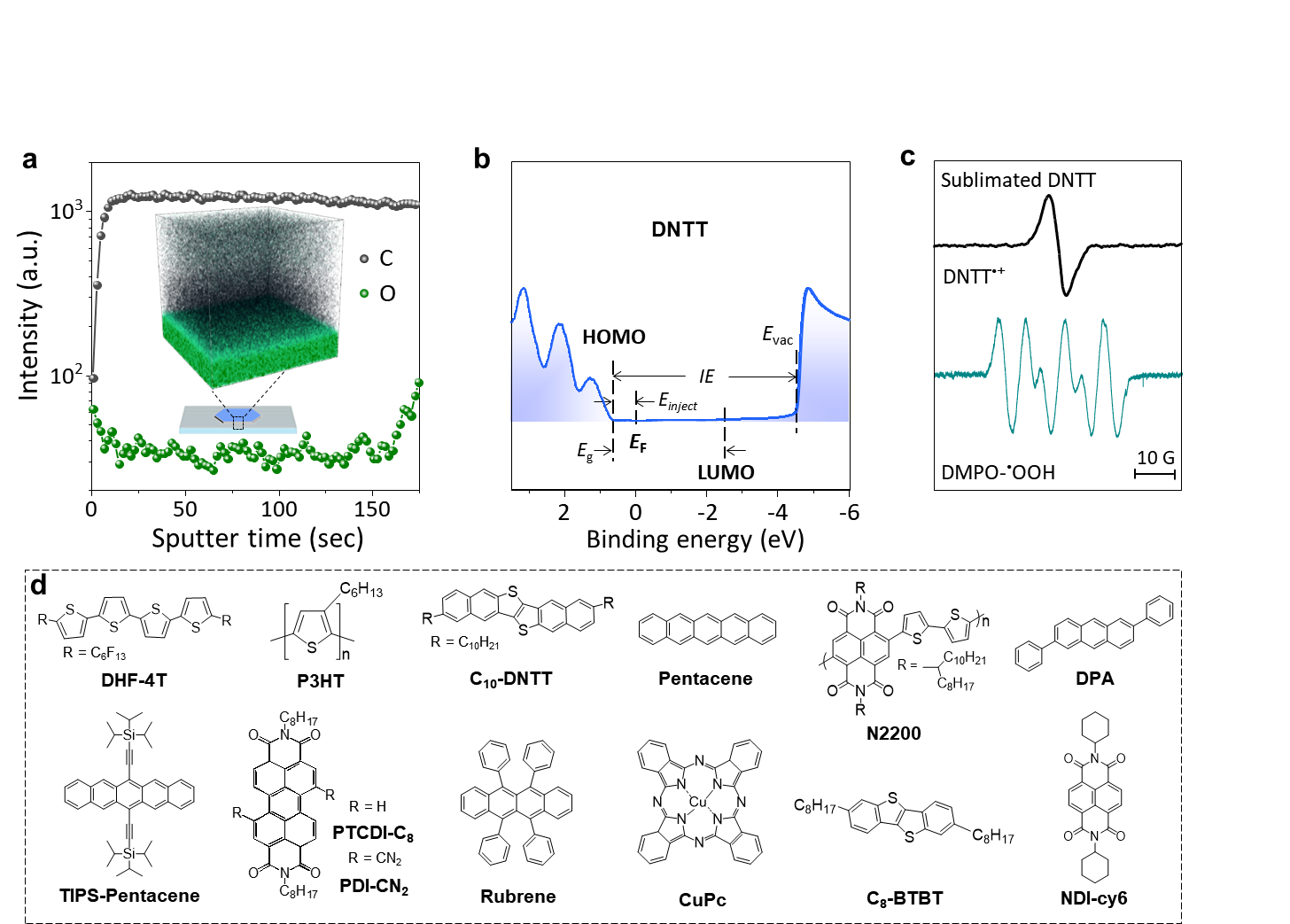 图1. a, DNTT单晶C和O元素TOF-SIMS分析。插图是深度轮廓的三维重建。b,从DNTT薄膜的UPS测量中提取的价带光电子发射光谱和二次电子光谱。从UPS结果中得到电离能(IE)、真空能级(Evac)和注入势垒(Einject),从紫外-可见吸收光谱中得到能隙(Eg),从而确定了HOMO、LUMO和EF的位置。c, 有机自由基阳离子和DMPO-OOH(DMPO与超氧阴离子(O2−)的加合物)的EPR信号,表明有机半导体中存在固有的氧掺杂。d,本研究所采用的有机半导体的分子式。