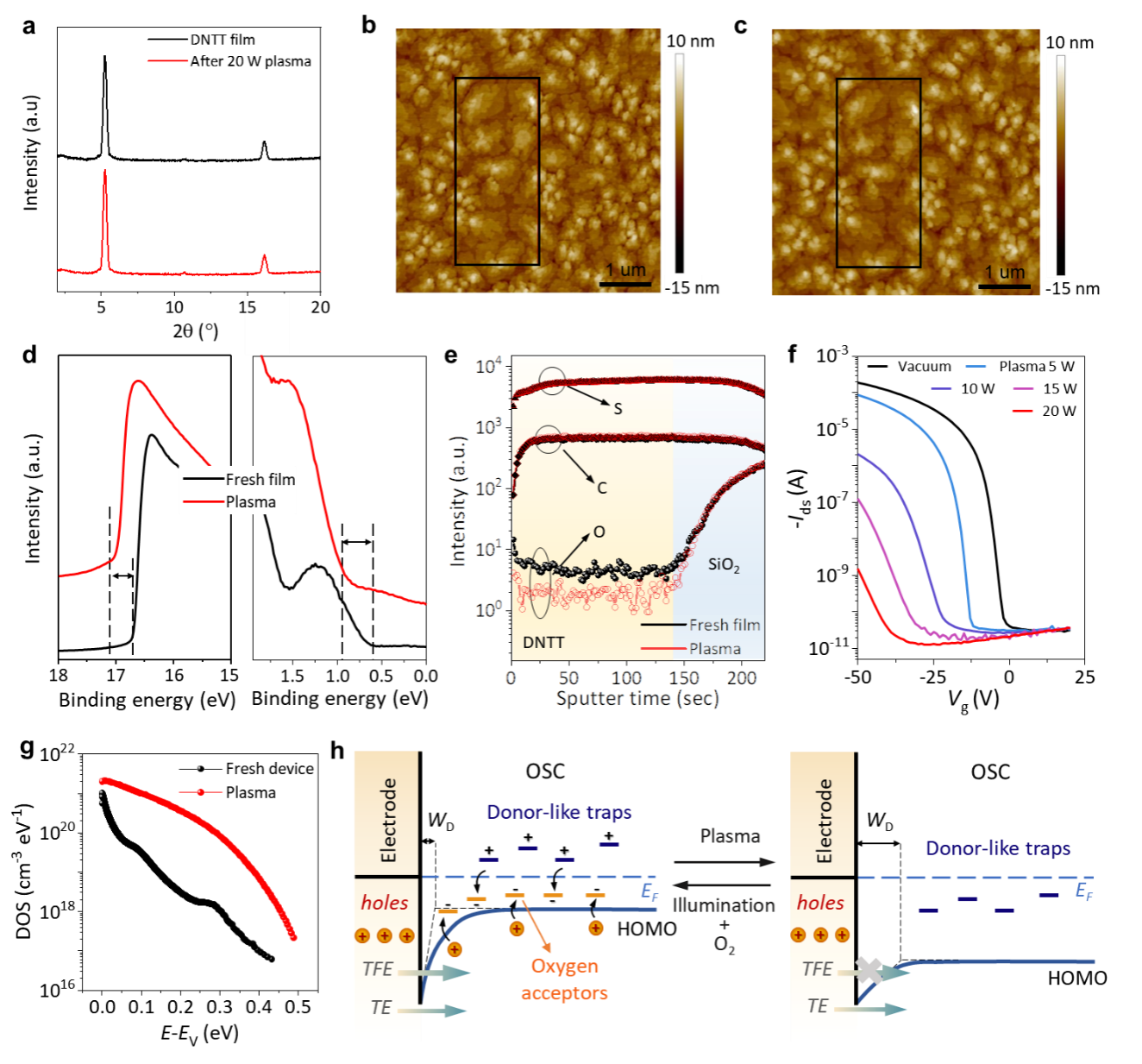 图2. 去掺杂前后DNTT薄膜的x射线衍射光谱(a)和原子力显微镜下的表面形貌图像(b、c),显示出去掺杂方法的无损特性。d, 去掺杂处理前后DNTT薄膜的UPS谱图。e, 去掺杂前后DNTT薄膜中C、S、O元素的TOF-SIMS分析。f, 在去掺杂处理下DNTT OFET的p型转移特性逐渐消失。g, 用FET法提取等离子体处理前后的OFET的陷阱DOS。h去掺杂前后OFET的能带模型。