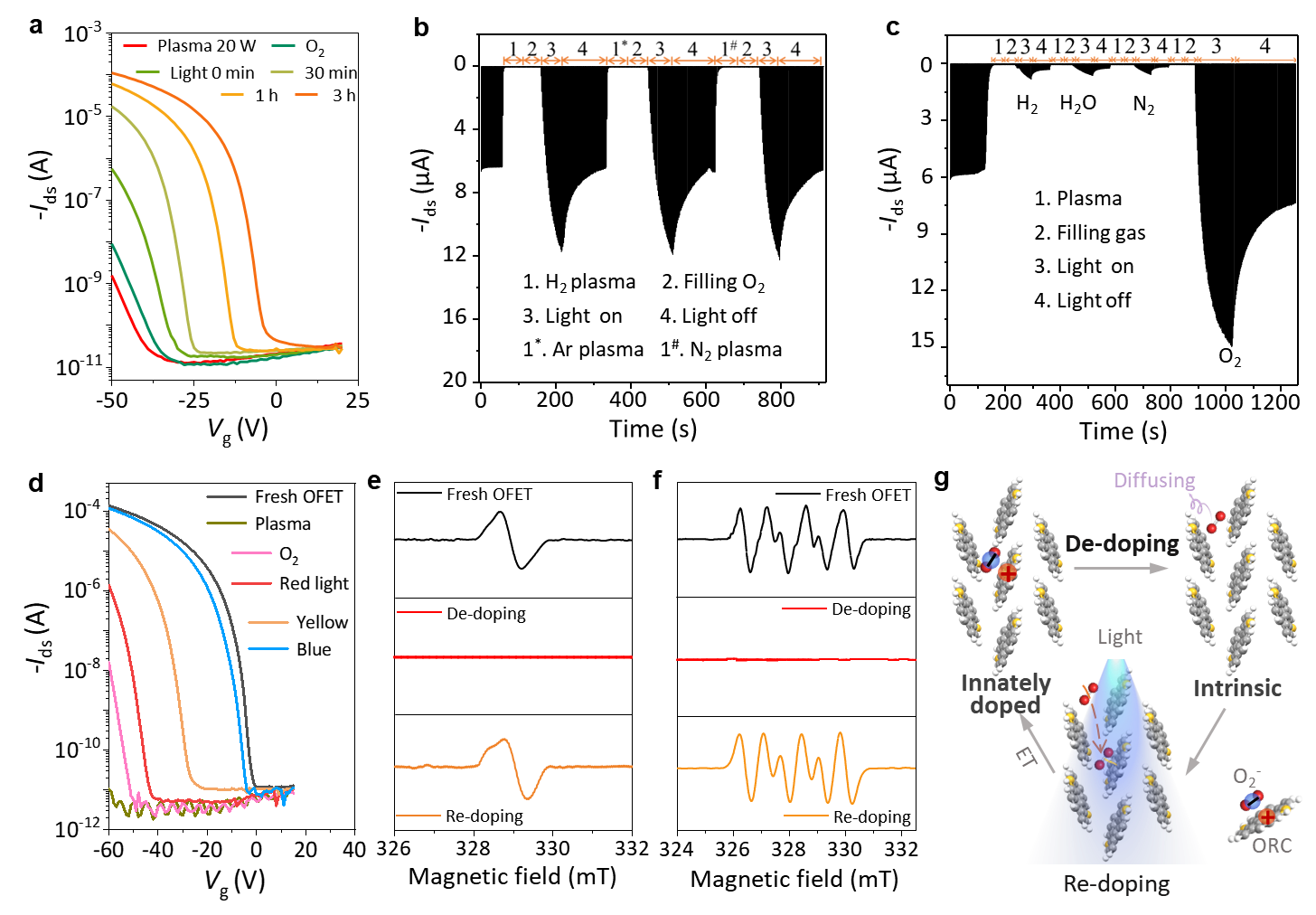 图3. a, 在氧气中进行光照,去掺杂的DNTT OFET的p型转移特性逐渐恢复(即再掺杂过程)。 “等离子体20w”的红色曲线与图2f相同。b, c 超薄(约5 nm) DNTT OFET在H2、Ar和N2等离子体处理 (b) 和H2、H2O (Ar)、N2和O2下光照(c)多次去掺杂和再掺杂过程的开关循环曲线。当在H2、H2O (Ar被用作载气,通过带水的气体洗涤瓶传递H2O)和N2中光照时,电流显示出略微的恢复,这可能是由于这些气体中残留的O2(即使在纯化过气体中,氧气仍以ppm的水平存在(99.999%))。d,不同波长相同照射时间下,超薄(约5 nm) DNTT OFET在再掺杂过程中的转移曲线。e, f,有机阳离子自由基 (e) 和O2- (f) 在去掺杂和再掺杂过程中EPR信号的演变。g,去掺杂和再掺杂过程的示意图,显示了通过消除(等离子体处理)和再生(在O2中光照)有机阳离子自由基和O2- 从固有掺杂状态和去掺杂状态之间转换。