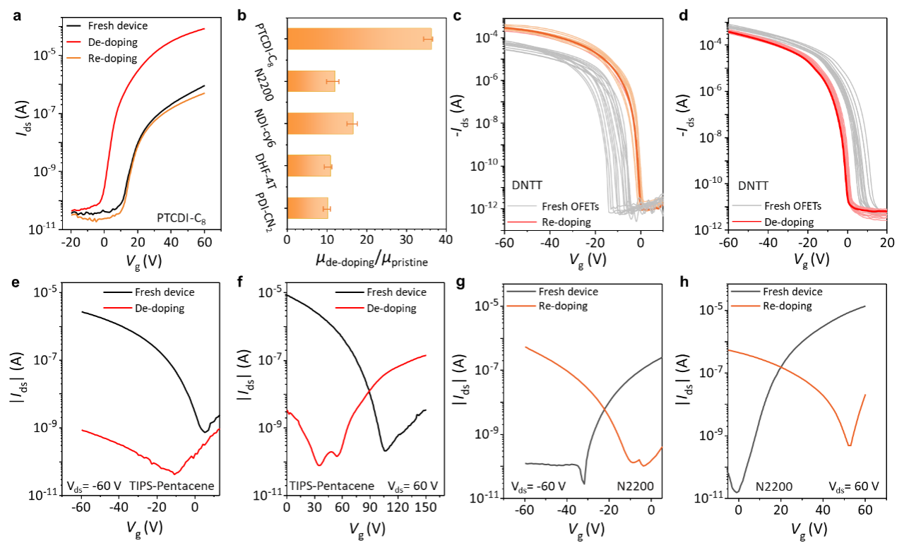 图4. 通过掺杂和去掺杂调控有机半导体器件的电子特性。a, PTCDI-C8 OFET的转移曲线表名去掺杂去除痕量氧显著增强了材料的电子输运性能,而再掺杂则逆转了这一过程。b,5种典型n型有机半导体去掺杂后迁移率增加。精确调制C10-DNTT OFET的阈值电压(从负(c)和正(d)值到接近零)。e, f,通过去掺杂将TIPS-Pentacene OFET从p型传输转化为n型传输。g, h,N2200 OFET通过再掺杂从n型转变为p型传输。