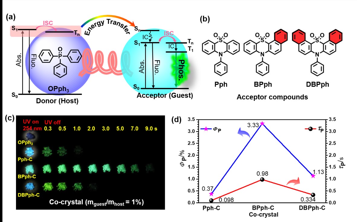 图1. a)给体(主体)和受体(客体)之间的能量转移示意图。b)受体的分子结构。c) 254 nm紫外灯照射和关闭时的共晶照片,mguest/mhost= 1%。“Pph-C”代表通过混合Pph和OPph3形成的共晶。d) Pph-C、BPph-C和DBPph-C的磷光量子产率和寿命。