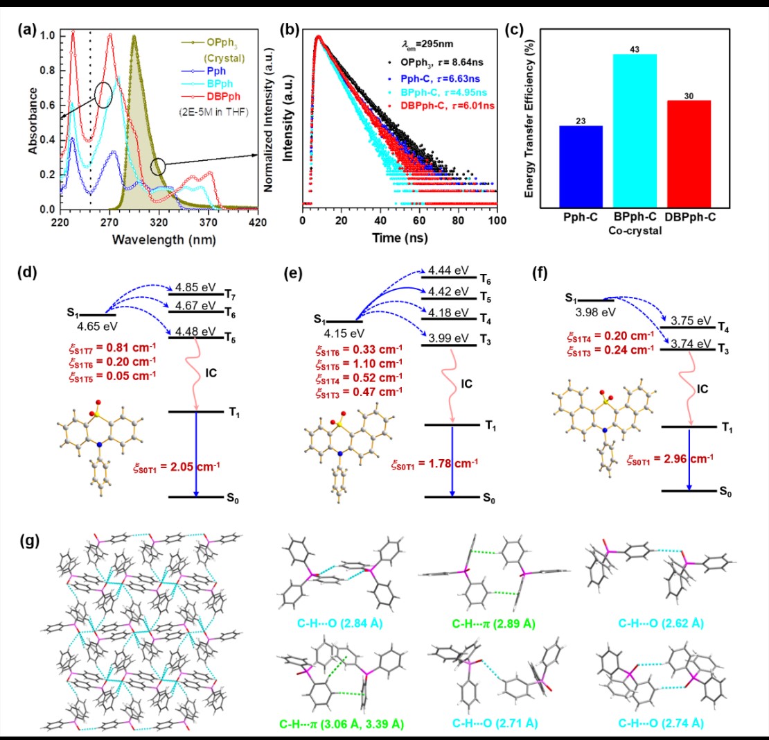 图2. a) OPph3晶体的PL光谱和Pph、BPph和DBPph在四氢呋喃溶液中的紫外可见吸收光谱;b) OPph3晶体和三种共晶的发射衰减特性(λem= 295 nm);c) OPph3在三种共晶中的能量转移效率;Ppy (d)、BPpy (e)和DBPpy (f)的S1和Tn之间的能级和自旋轨道耦合常数(x);g) OPph3的分子堆积(左)和分子间相互作用(右)。