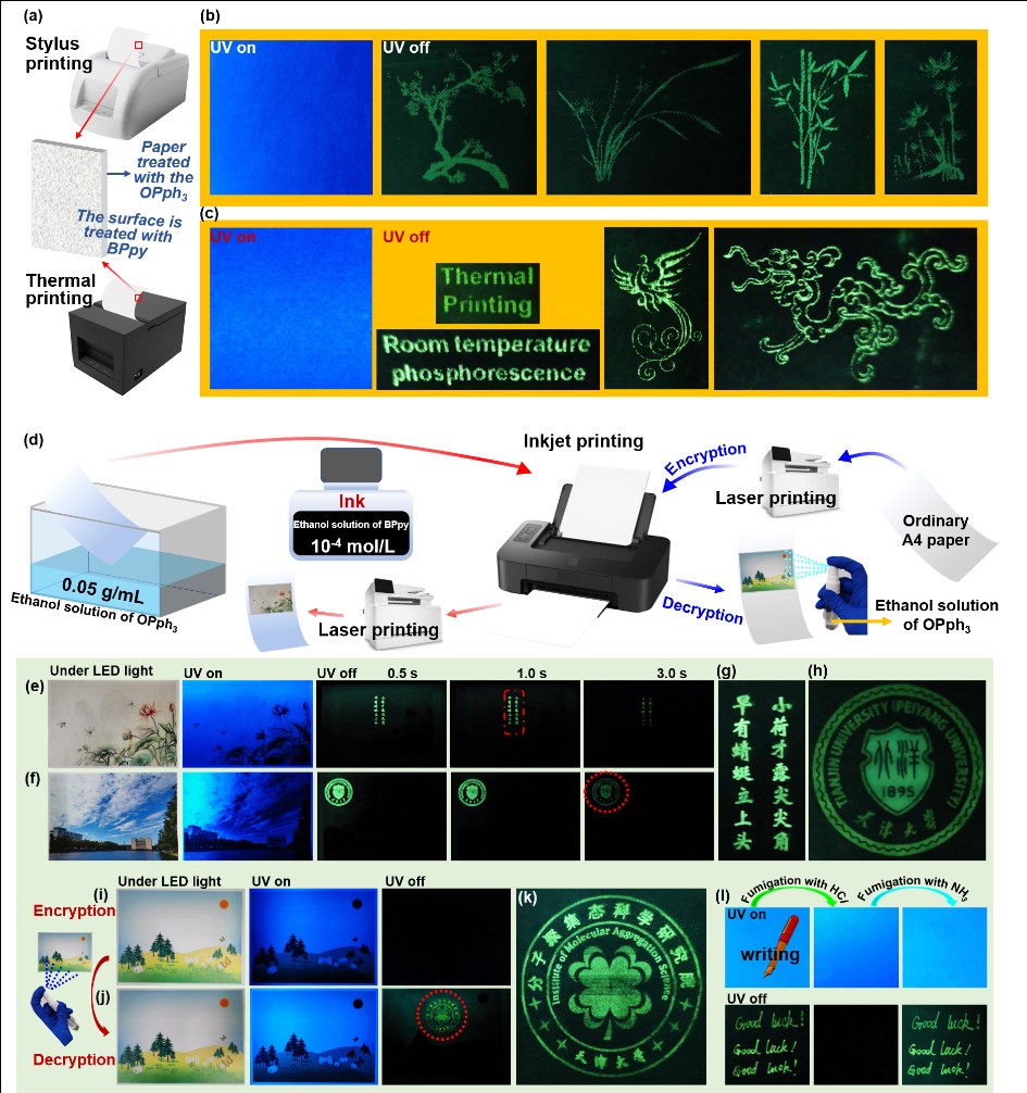最后,他们利用这些材料通过钢笔书写、热敏打印、针式打印和喷墨打印的方式成功应用于防伪领域。其中,用于喷墨打印的墨水使用了环境友好的乙醇溶液,浓度可以低至10-4M,被认为基本可以满足商业化的需求,从而使RTP材料更接近商业化。