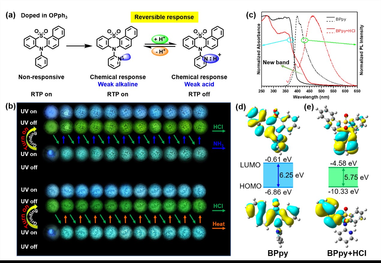 此外,在客体分子中引入吡啶基团使所得掺杂系统具有酸-碱可逆和酸-热可逆的刺激响应RTP效应。借此,首次实现了从研磨到化学刺激的多级刺激响应RTP特性(图3)。
