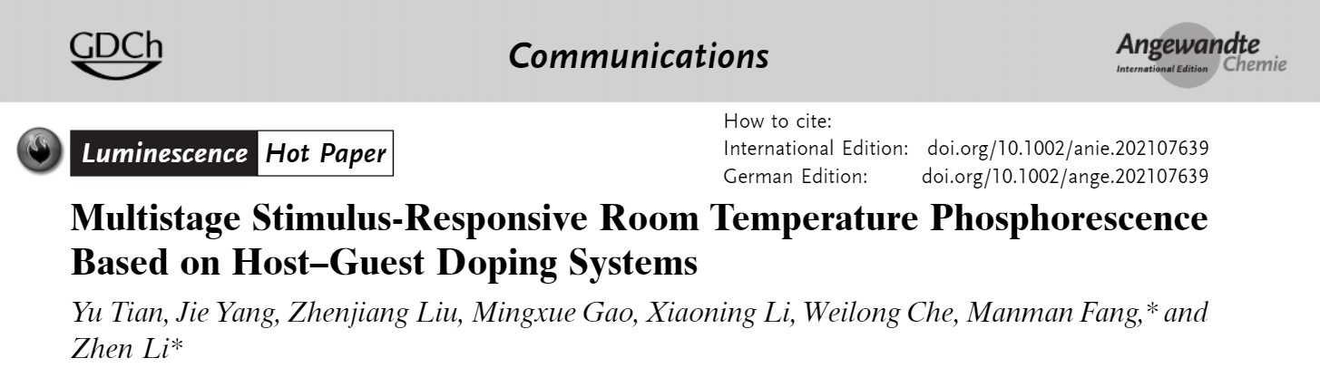 天津大学分子聚集态科学研究院李振教授课题组近期在国际权威期刊《Angewandte Chemie International Edition》上在线发表了题为“Multistage Stimulus-Responsive Room Temperature Phosphorescence Based on Host-Guest Doping Systems”的科研成果。研究院博士研究生田瑜为文章的第一作者,通讯作者为青年教师方曼曼博士和李振教授。