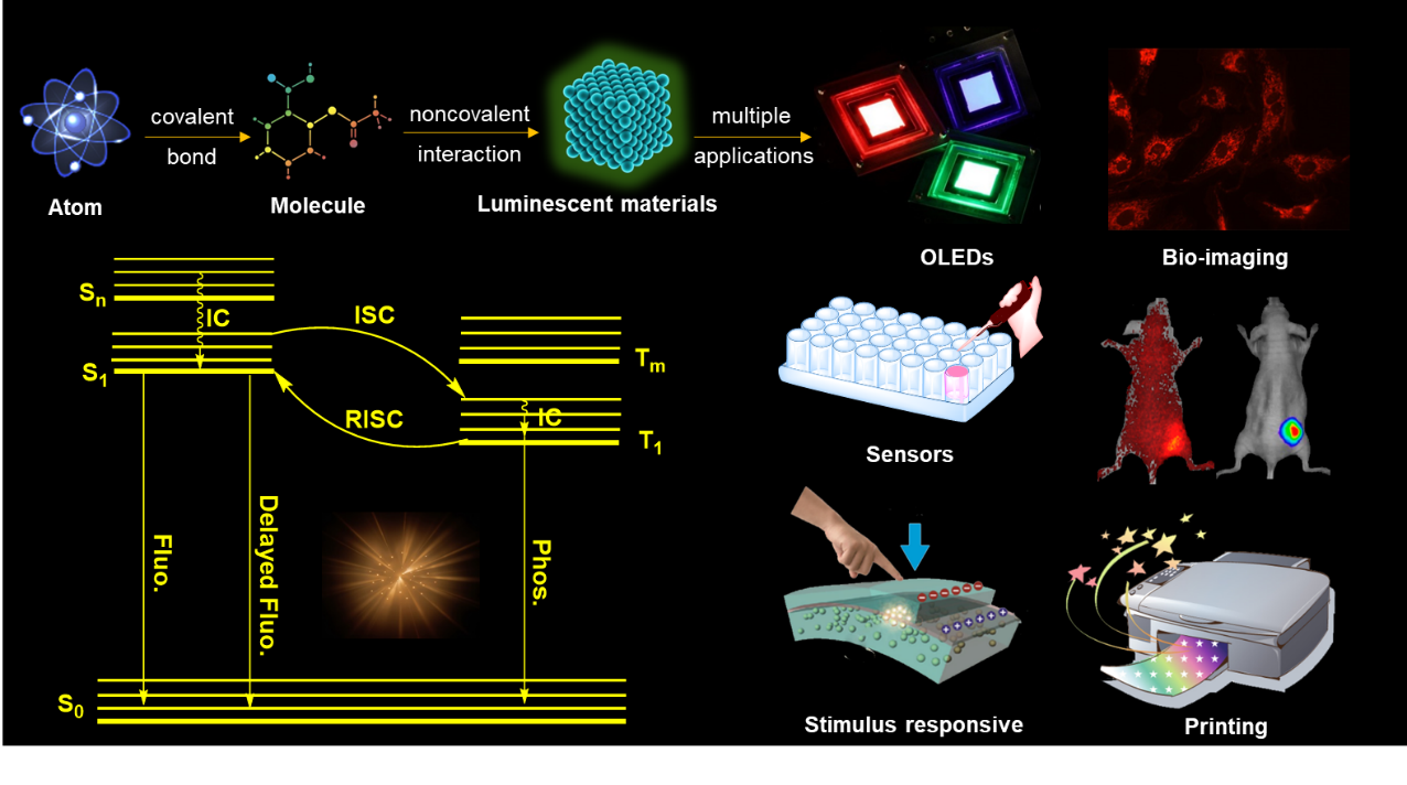 在该综述中,李振教授团队主要介绍了四种不同的发光形式,包括光致发光、力致发光、化学发光和电致发光。详细综述了有机化合物在这四种不同激发模式下的固态发光行为,包括聚集诱导发光、激基缔合物发光、非芳香化合物发光、热激活延迟荧光、纯有机室温磷光和非芳香室温磷光等,深入解析了分子结构及晶体堆积与其发光性质之间的密切联系。基于对聚集态发光行为的深入研究,李振团队在2018年提出了“Molecular Uniting Set Identified Characteristic (MUSIC)”的概念,强调分子聚集态结构对有机光电功能材料性能的重要影响及其研究意义。最后,该综述还介绍了一些纯有机发光材料的典型应用场景,包括有机发光二极管、光学传感、刺激响应、生物成像和防伪打印等。该综述能促进科研工作者对于聚集态发光行为的理解,从而帮助甚至引导有机固态发光材料的进一步开发与发展。
