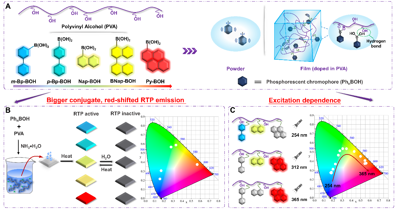 图1. 目标产物分子结构、水/热刺激响应以及激发依赖的室温磷光机制示意图