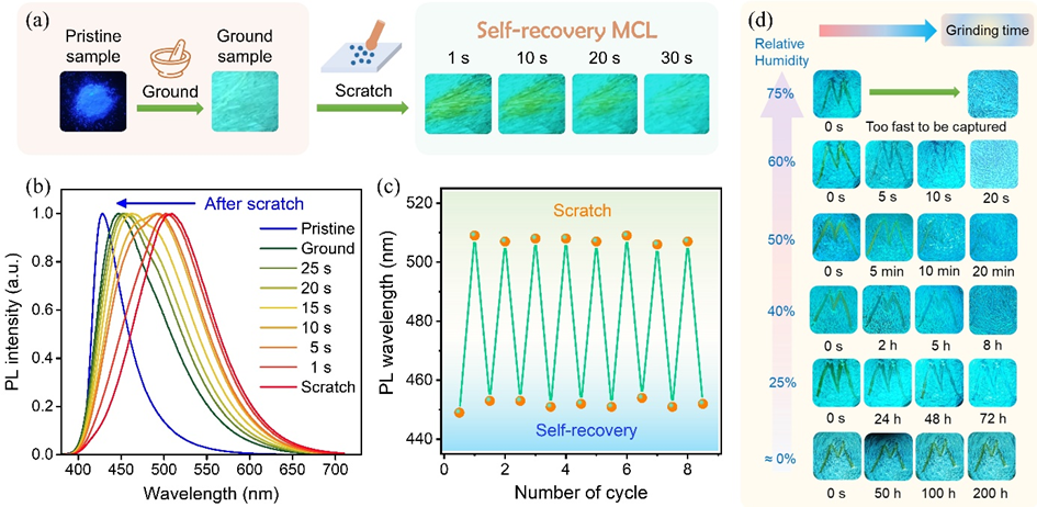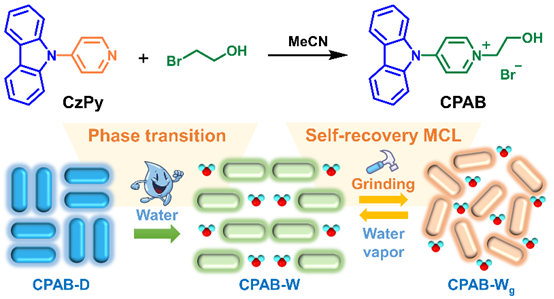 有机力致变色材料作为一类智能材料,因其在应力传感、信息加密及防伪领域的应用而受到广泛关注。在施加力刺激时,由于分子构象和排列的变化,其发光颜色会发生变化。对于大部分力致变色材料,为了实现发光性质从无定型态向晶态的转变,通常需要将材料置于有机溶剂的蒸气氛围中,这影响了其在实际场景中的应用。水蒸汽在大气中广泛存在,开发对水蒸汽响应的有机力致变色材料具有重要意义。
