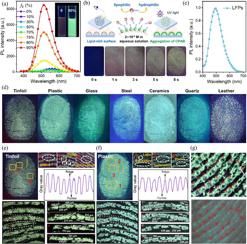 吡啶盐CAPB良好的两亲性被应用于指纹识别。CPAB分子具有聚集诱导发光性质,能够聚集在指纹皮脂分泌物表面,分子运动受限而呈现明亮的绿色发光,达到指纹显影效果。作为指纹显影剂,CPAB具有诸多优势。首先,CPAB能够以水作为溶剂,显影过程无需使用有机助溶剂,避免了对指纹精细结构的破坏,在各种基质,如锡箔纸、塑料、玻璃、铁、陶瓷、石英,以及粗糙的皮革表面均有良好的显影效果;其次,CPAB的工作浓度低,可在20 μM浓度下具有对指纹的高分辨率显影,而且显影时间短,5 s即可显示清晰的指纹图像;最后,CPAB指纹显影的分辨率极高,对三级指纹细节(指纹脊宽度、汗孔分布等信息)具有非常清晰的可视化效果。可以说,CPAB的指纹显影是目前指纹显影剂的最好结果之一,对身份识别与犯罪场景指纹证据收集具有重要意义。